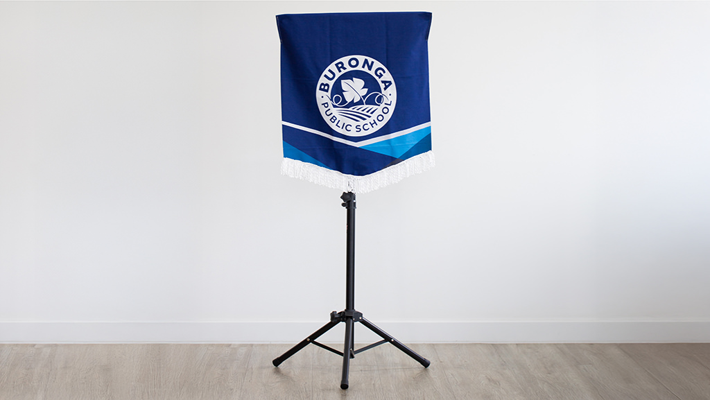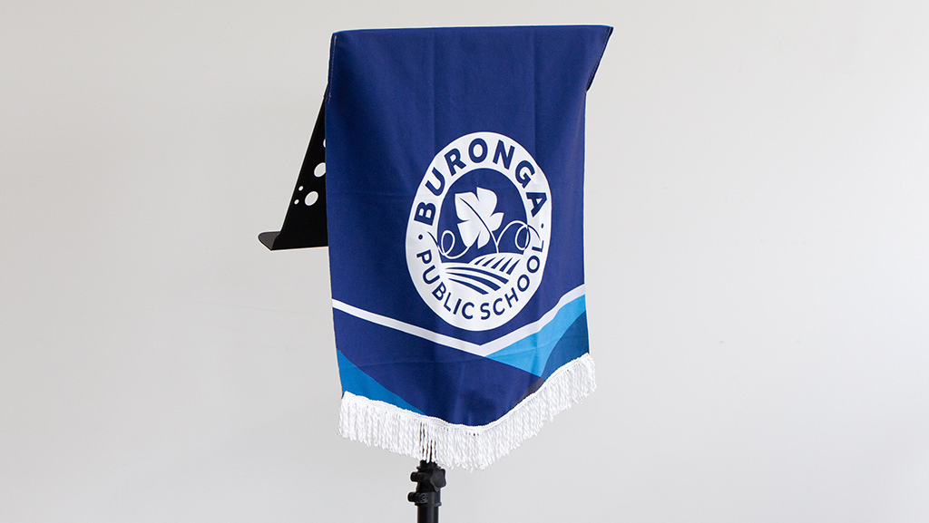 Give every ensemble a professional, unified look. Our custom banners are designed in Australia and precision-made overseas from 280g flame-retardant blockout fabric—so colours pop on stage and distractions behind stands stay hidden. Choose classic fringes (gold, white, or select colours) to match your school crest or house identity.
